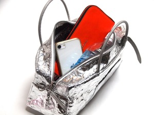 長財布や小物類、500mlペットボトルもしっかり収まるサイズの天ファスナー横長フォルムバッグです。