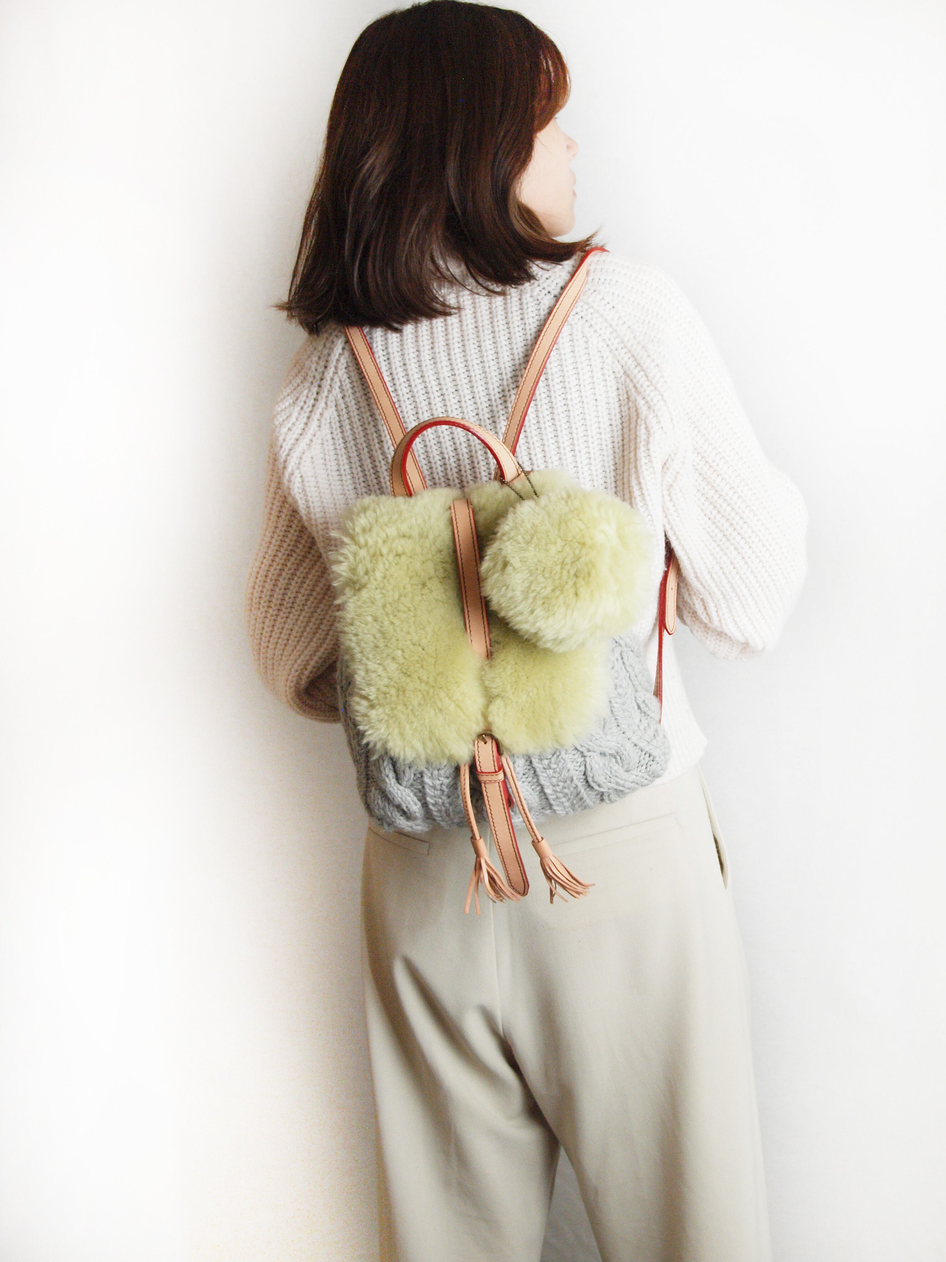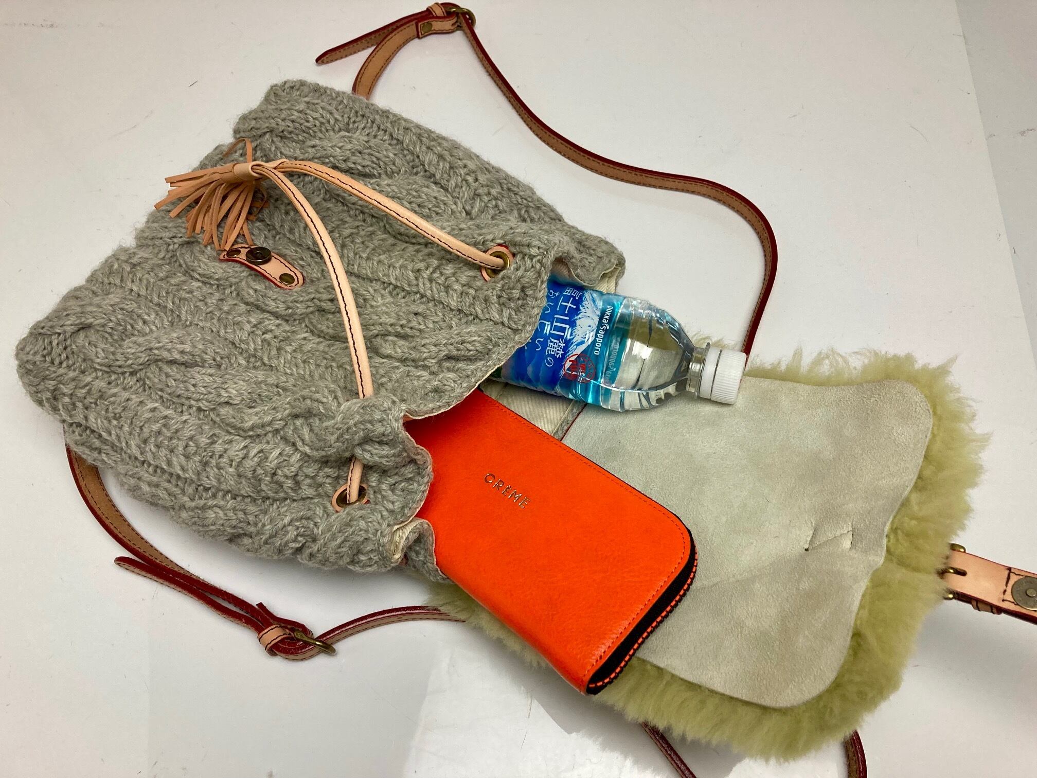 長財布、500mlペットボトルも収納できるリュックMサイズです。小物を収納できるムートンチャームが付いています。