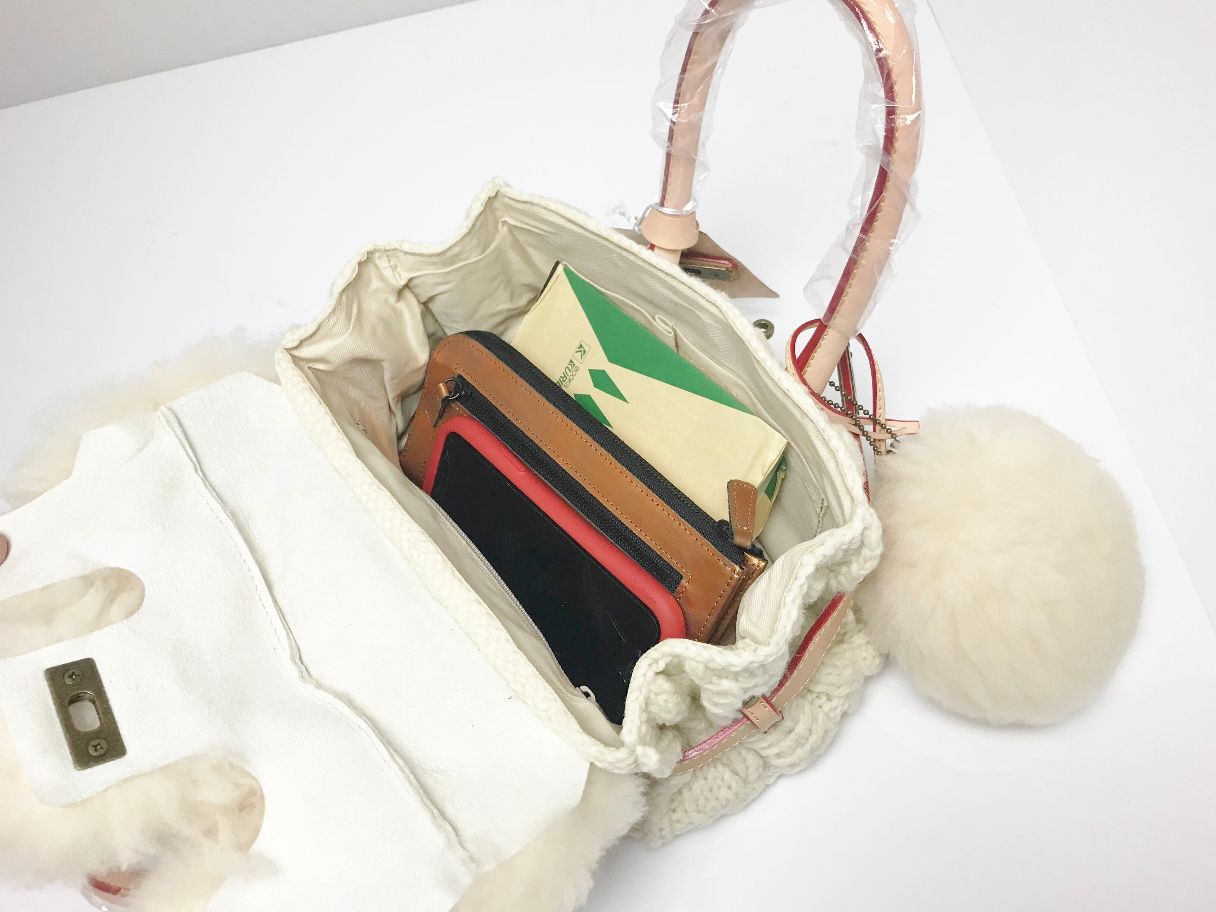 スマホや長財布、500mlペットボトルも収納出来ます。小物を収納できるムートンチャームが付いています。