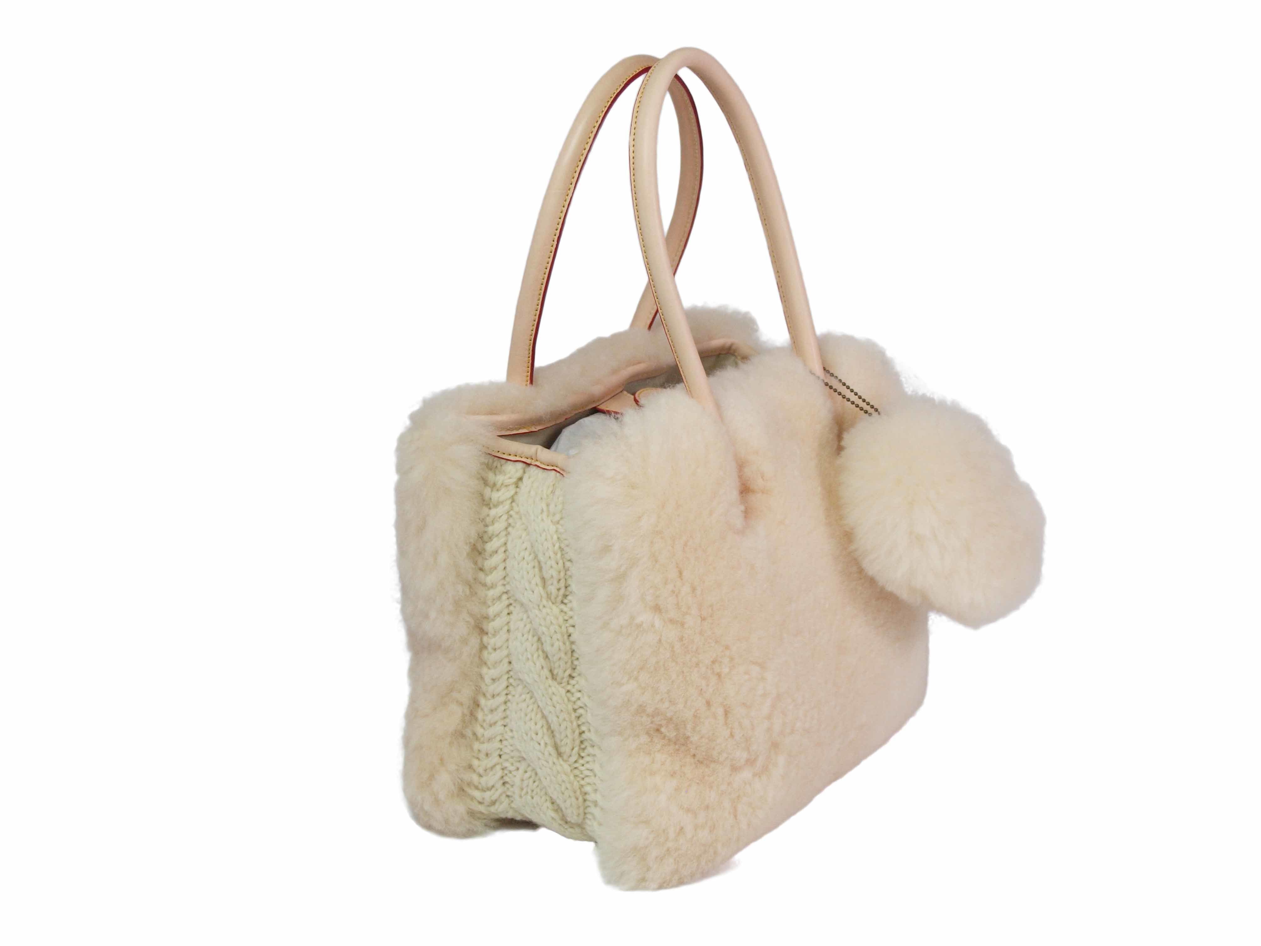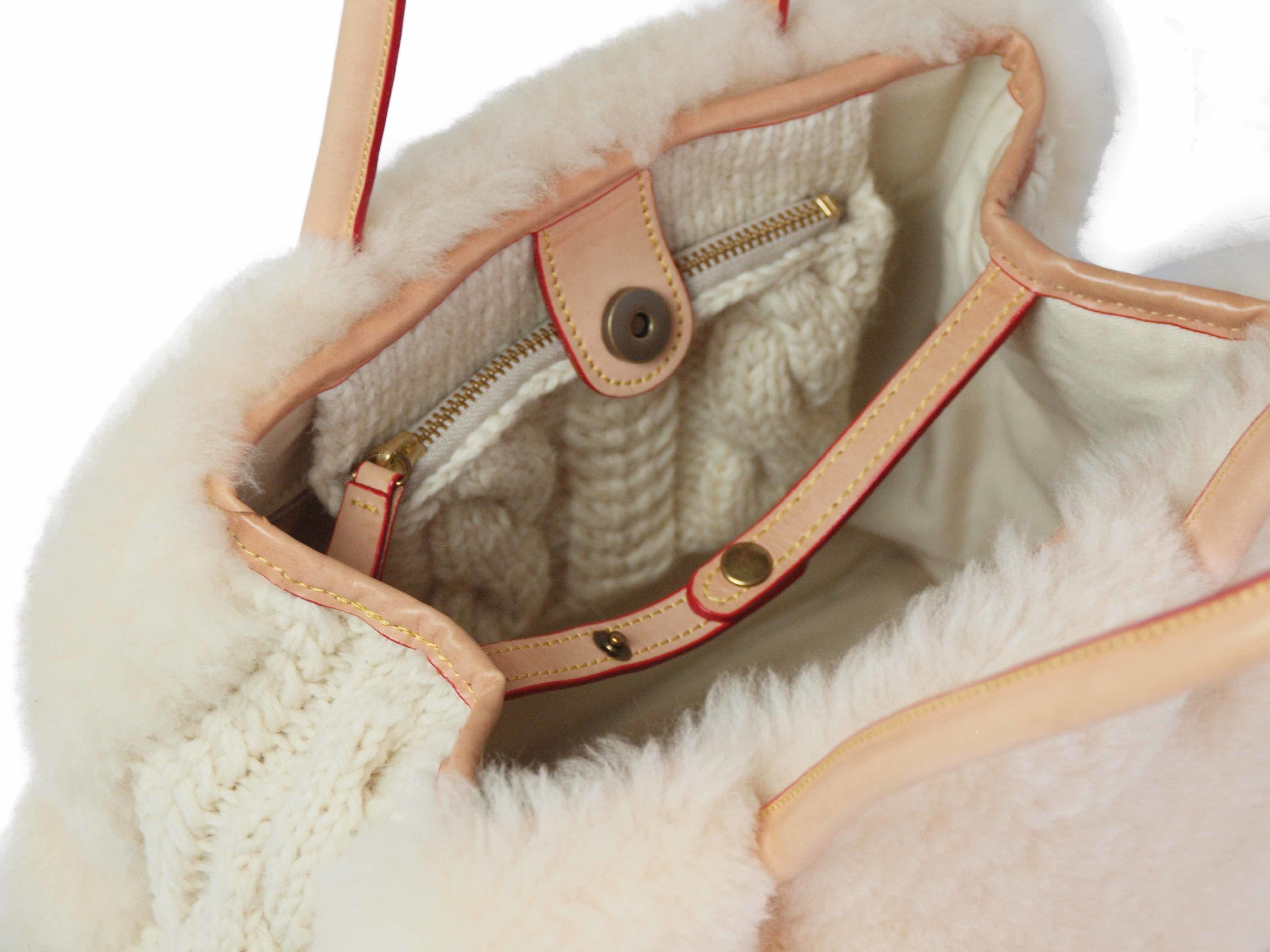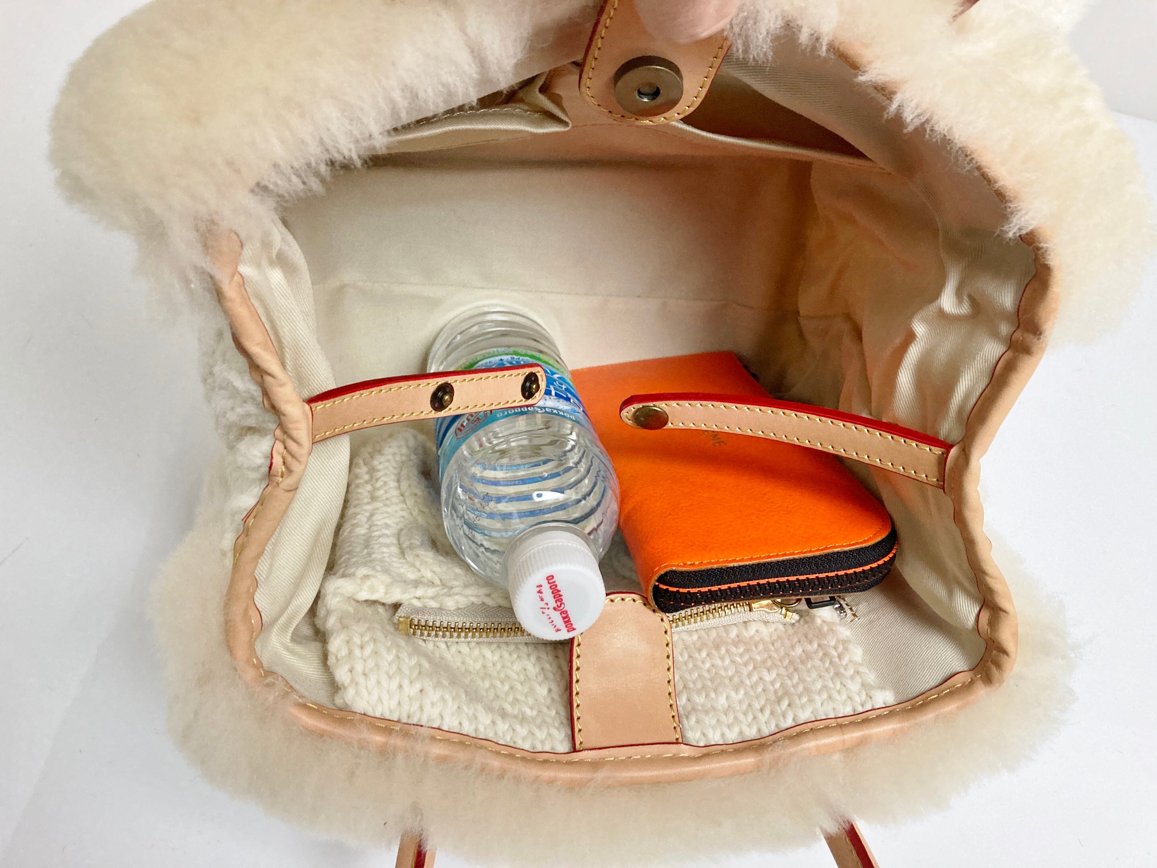 長財布、500mlペットボトル、IPADなど収納力のあるトートです。小物を入れるるムートンチャームが付いています。