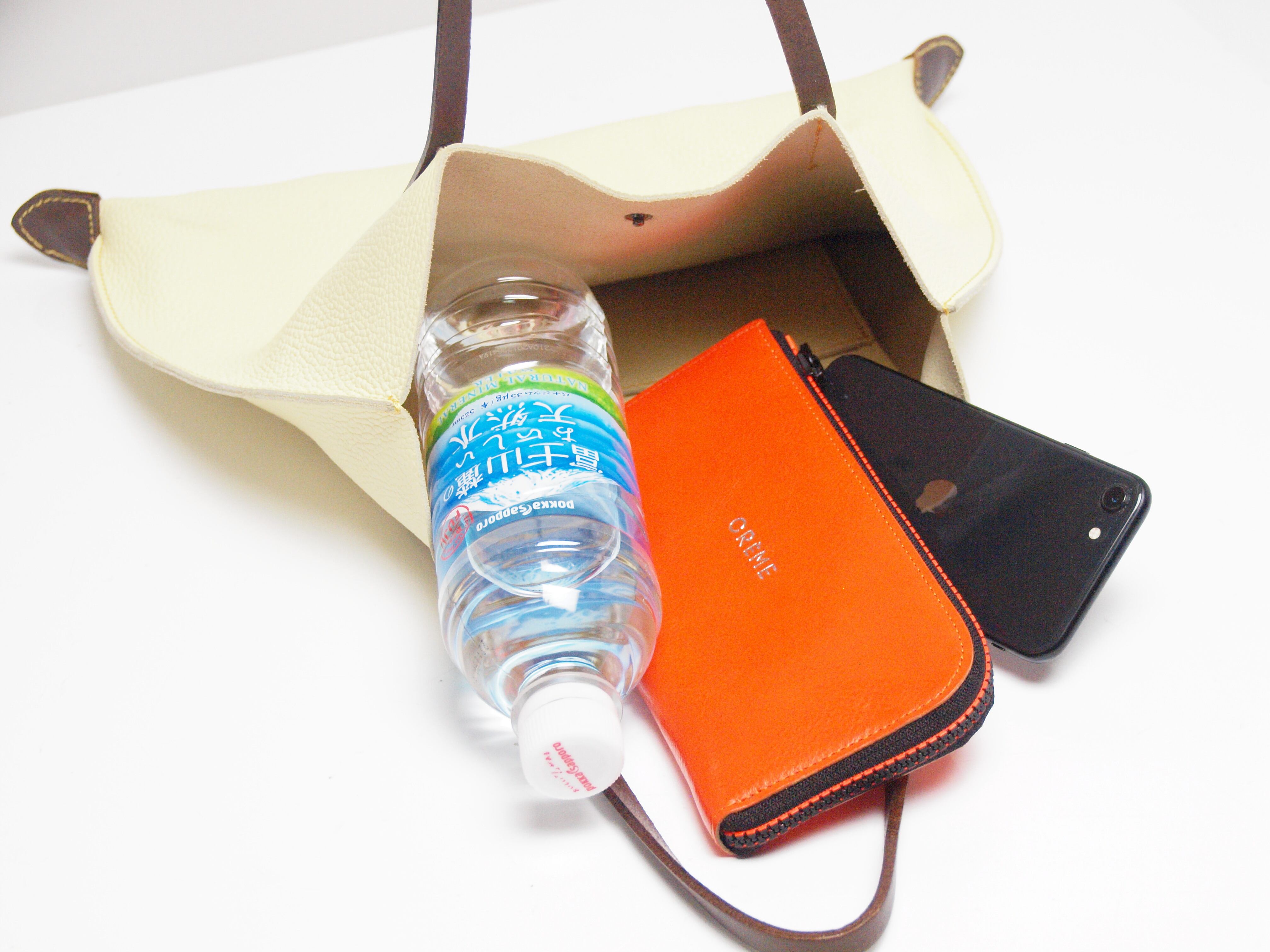 小振りながら、500mlペットボトル、長財布・携帯・ハンカチ・化粧ポーチなどの必需品はしっかり収納できます。