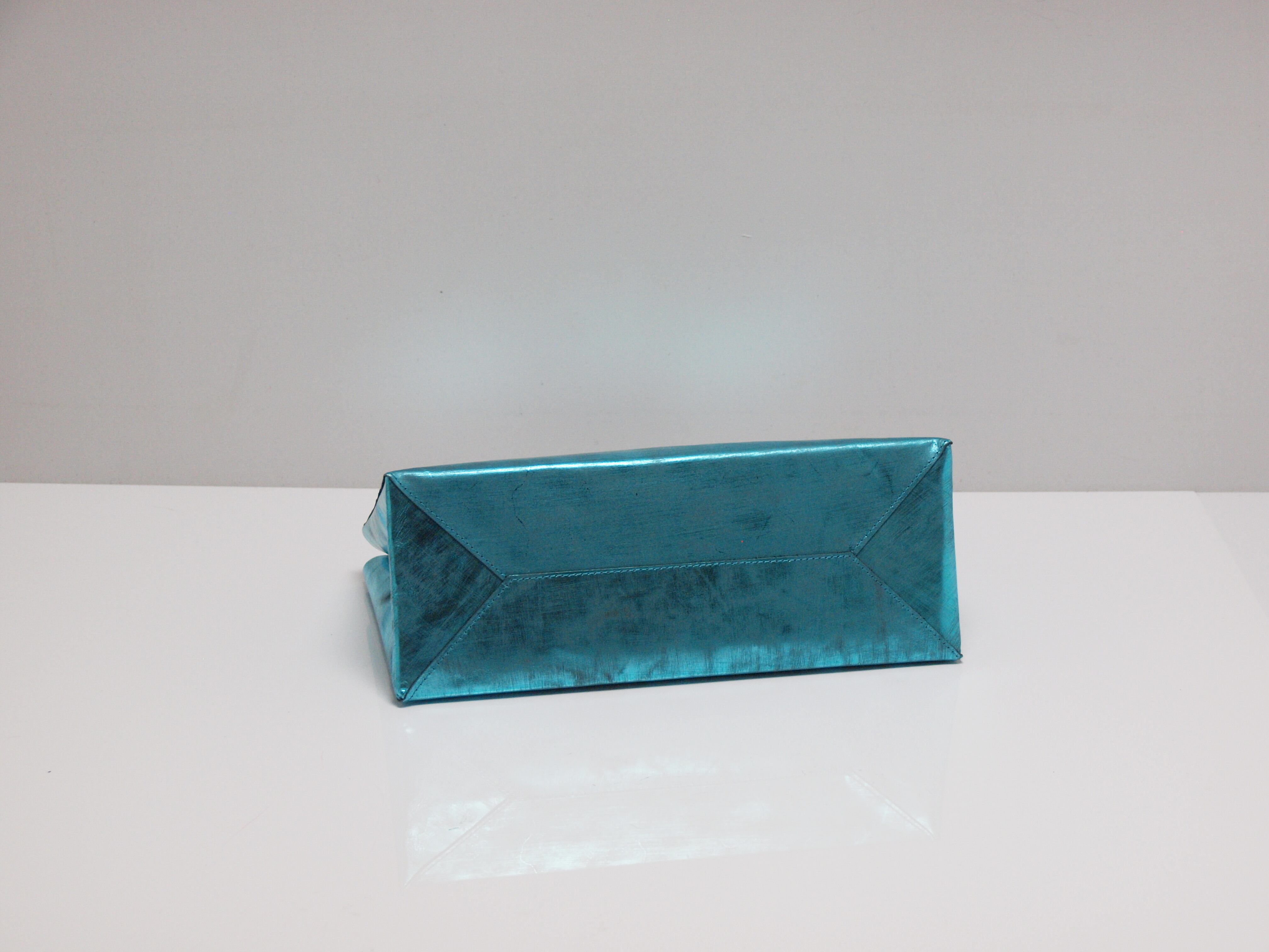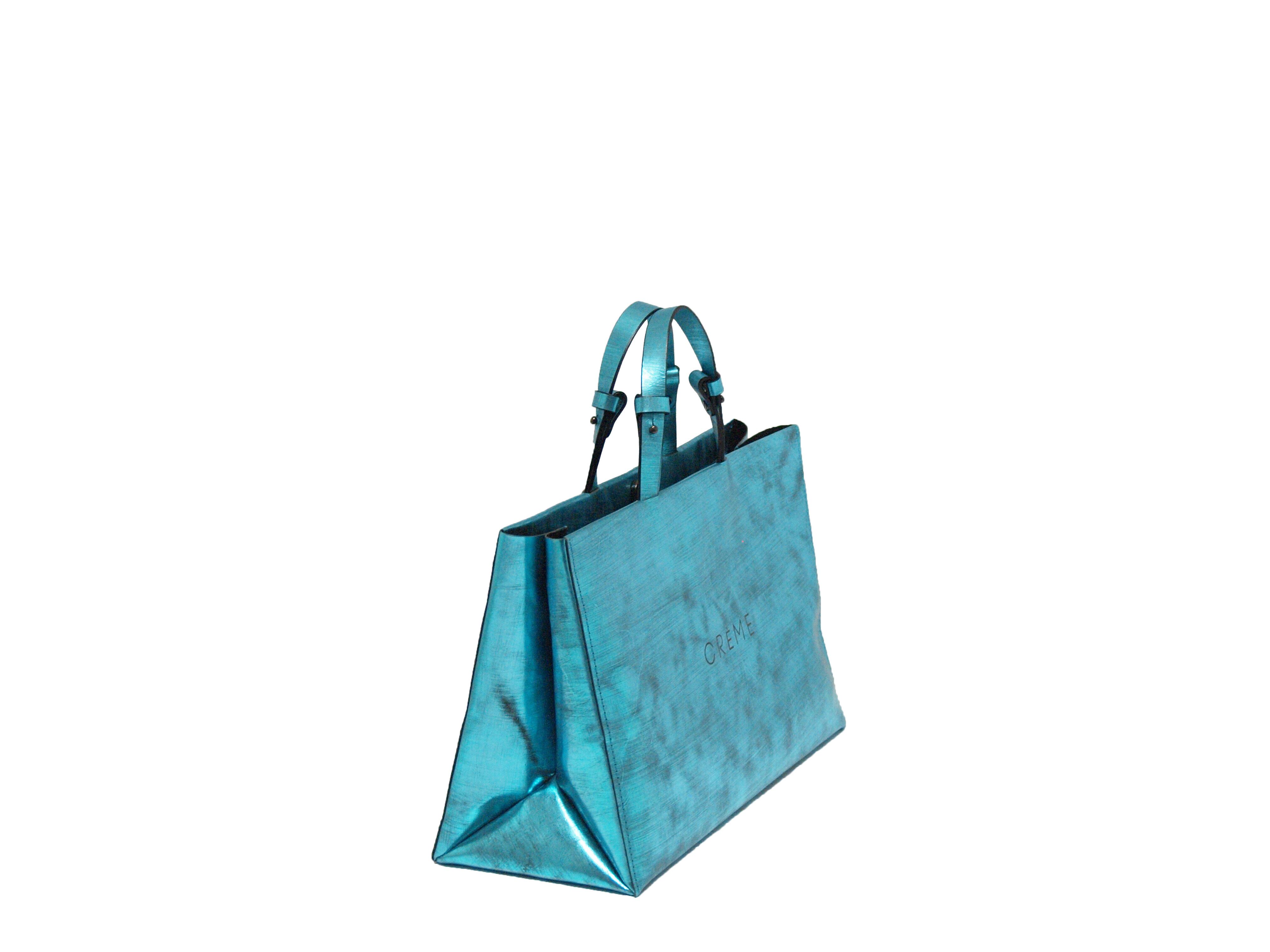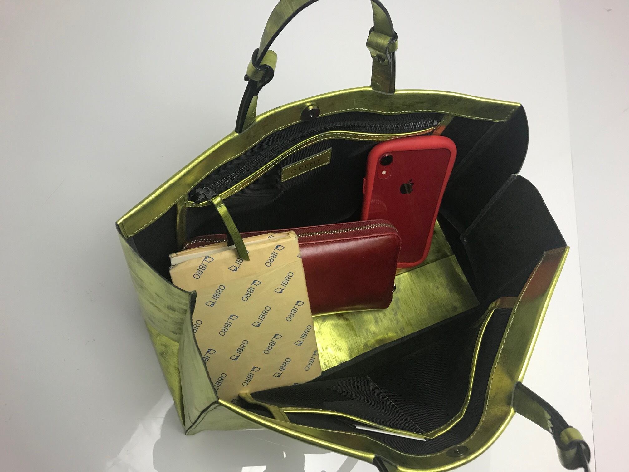 箔を貼ったキップレザー(牛革)にヴィンテージ加工(ダメージを与える為に革を削る)を施しており、見た目以上に軽いバッグです。