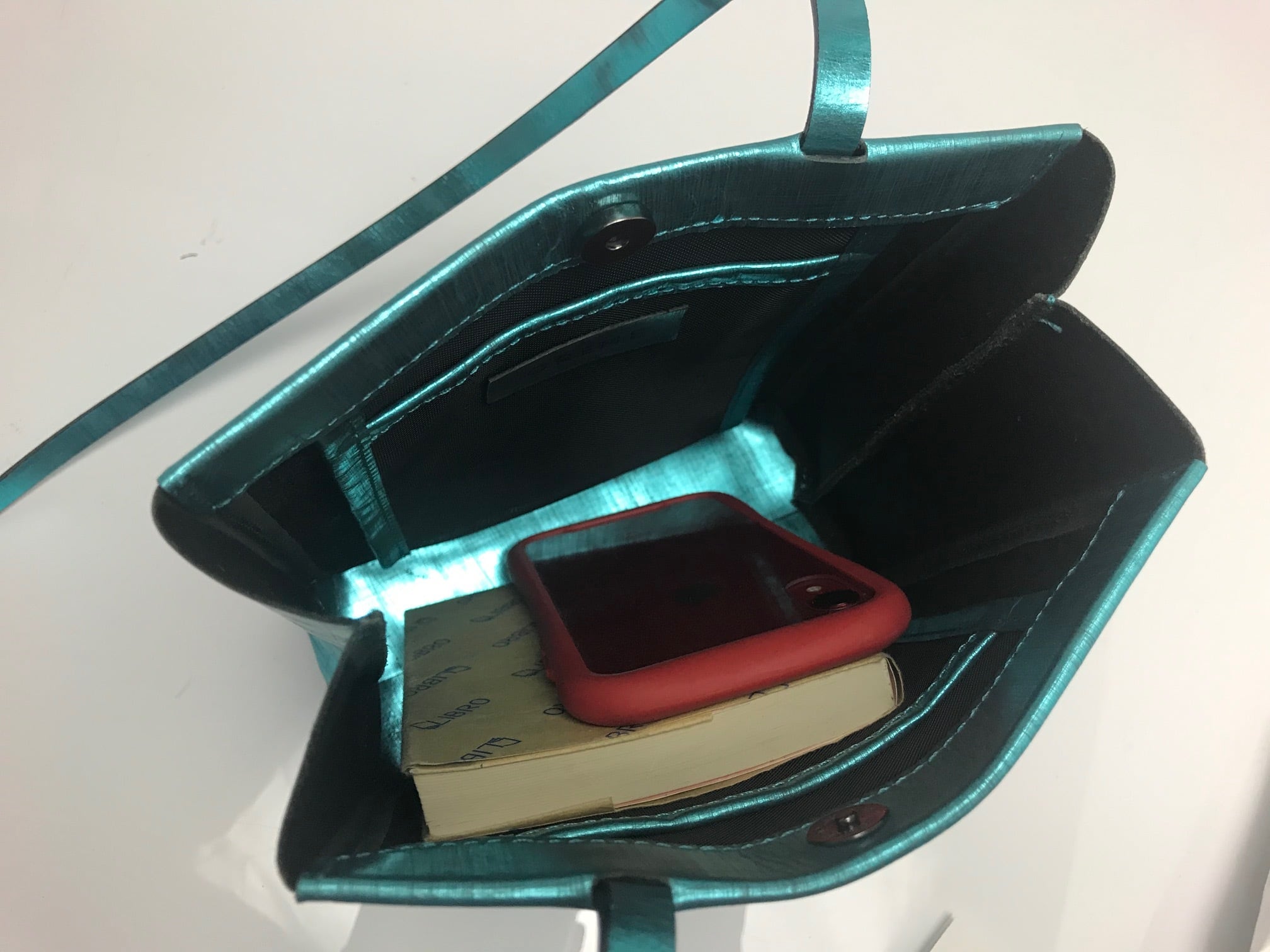 小サイズながら二つ折り財布、携帯や文庫本などがしっかり収納できます。