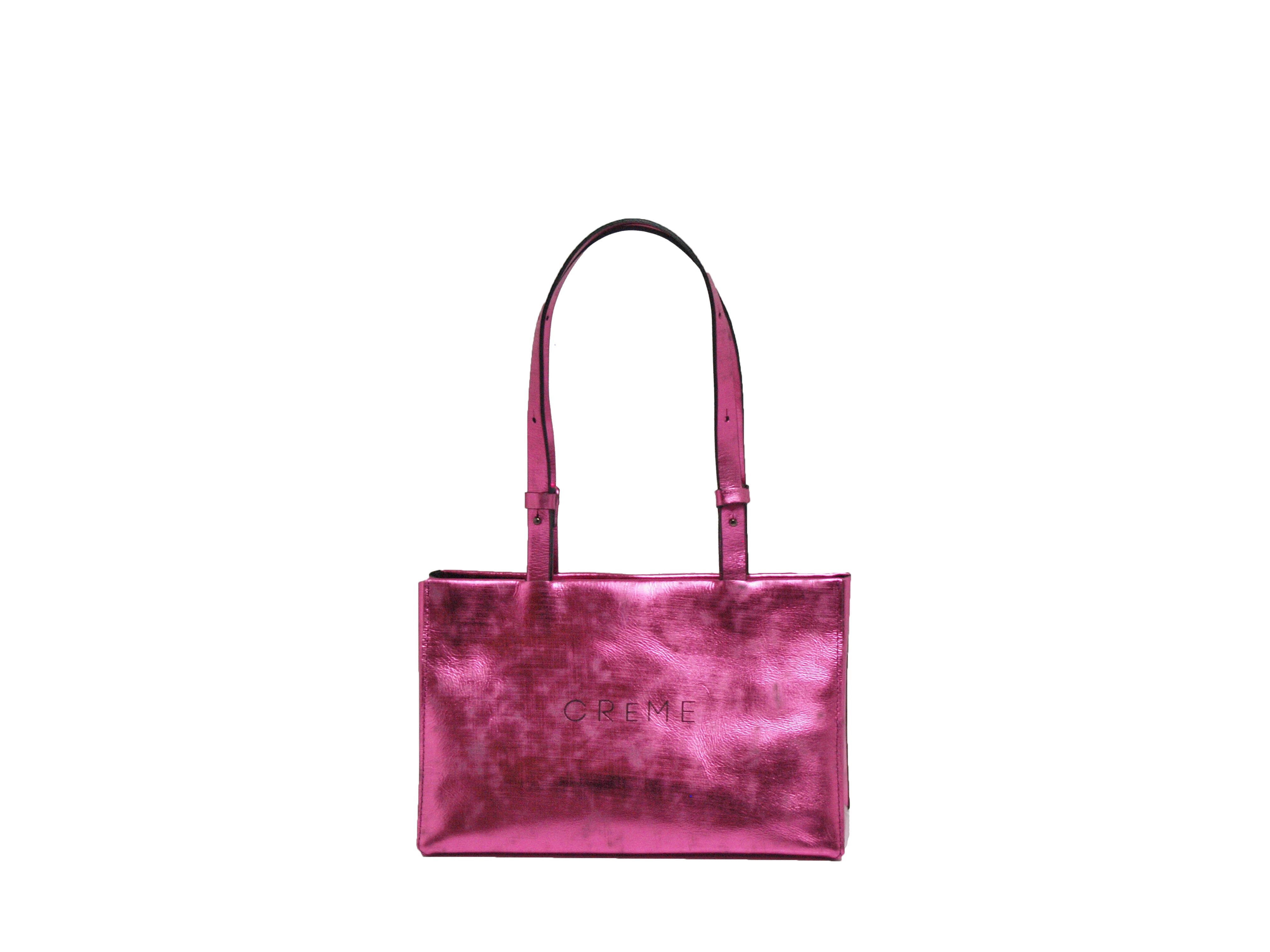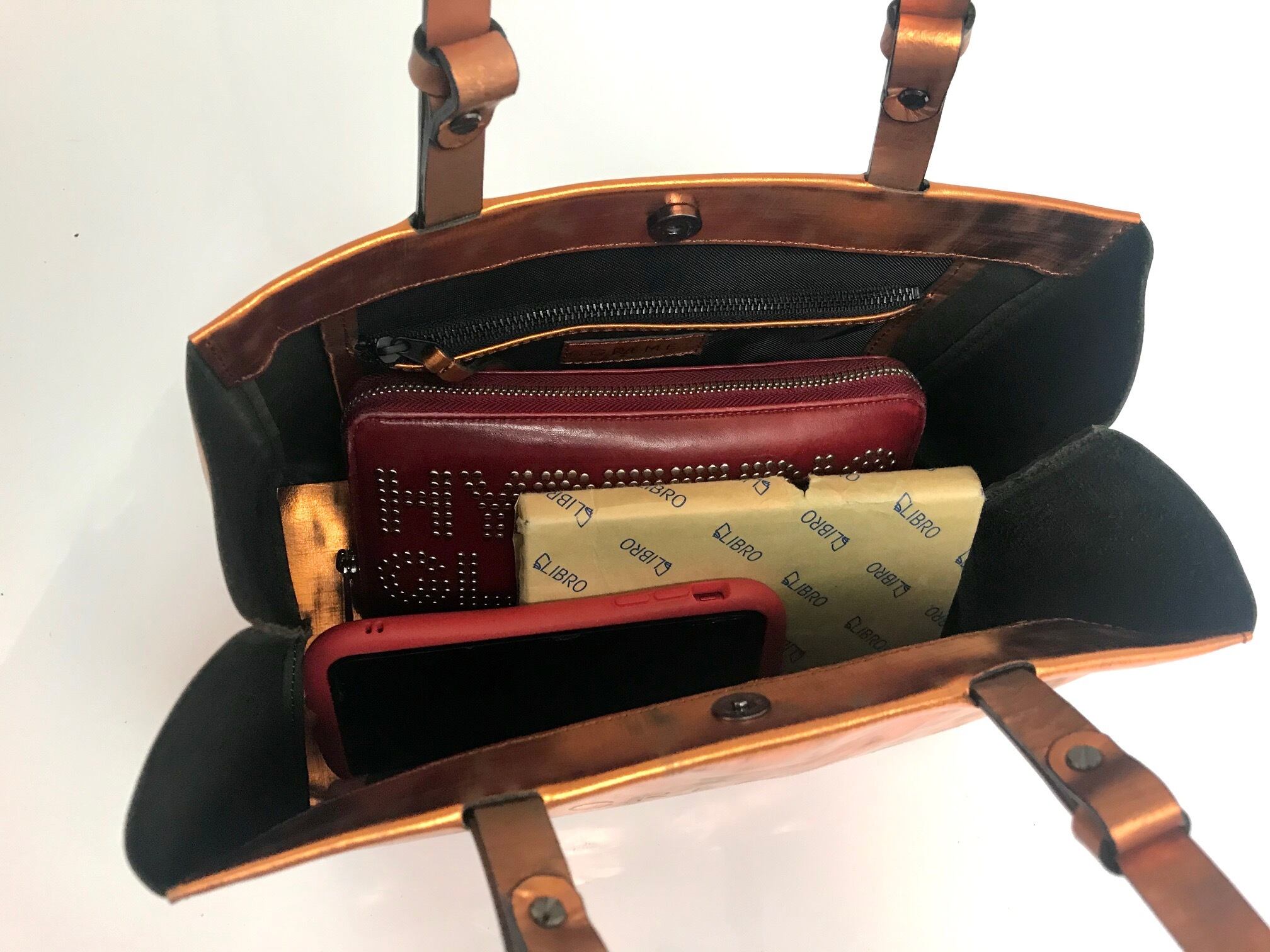 箔を貼ったキップレザー(牛革)にヴィンテージ加工(ダメージを与える為に革を削る)を施しており、見た目以上に軽いバッグです。