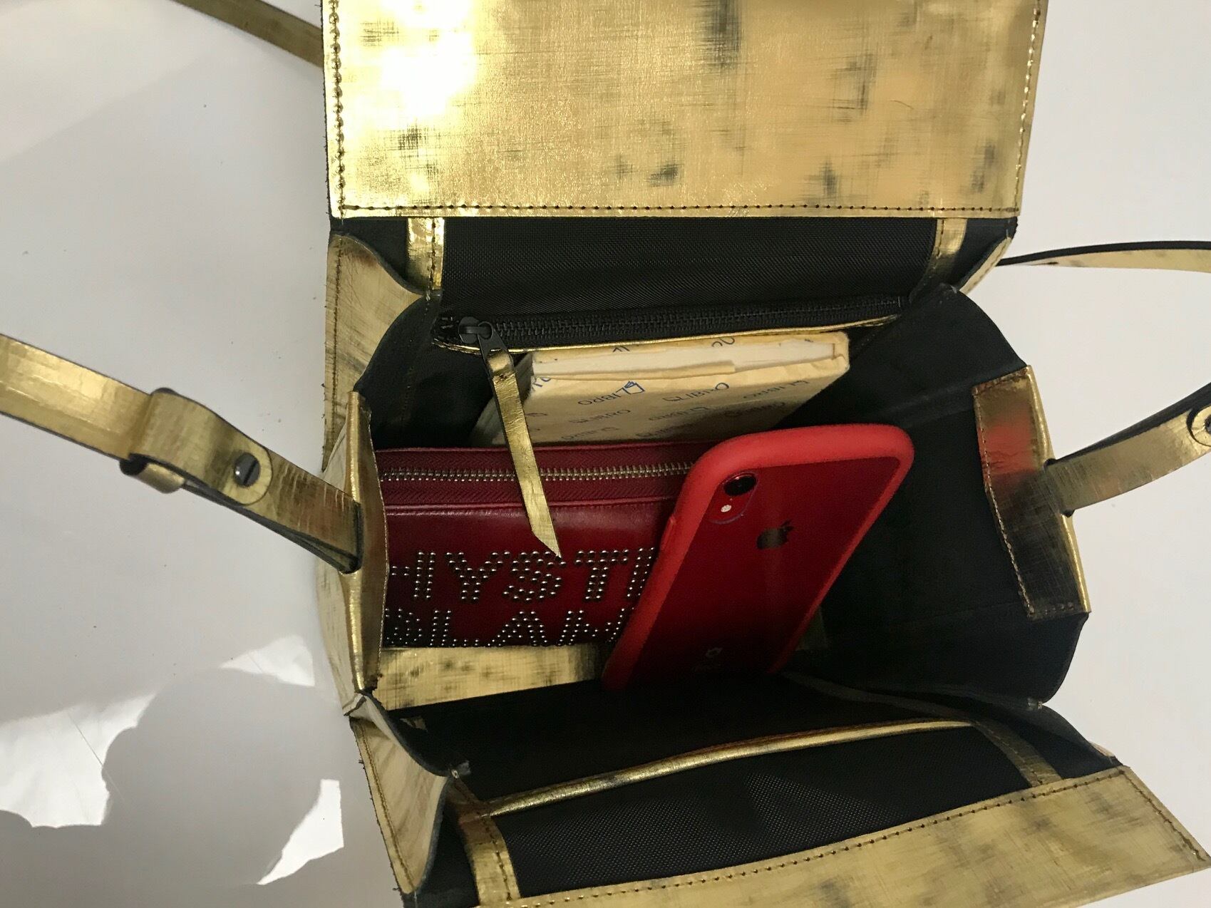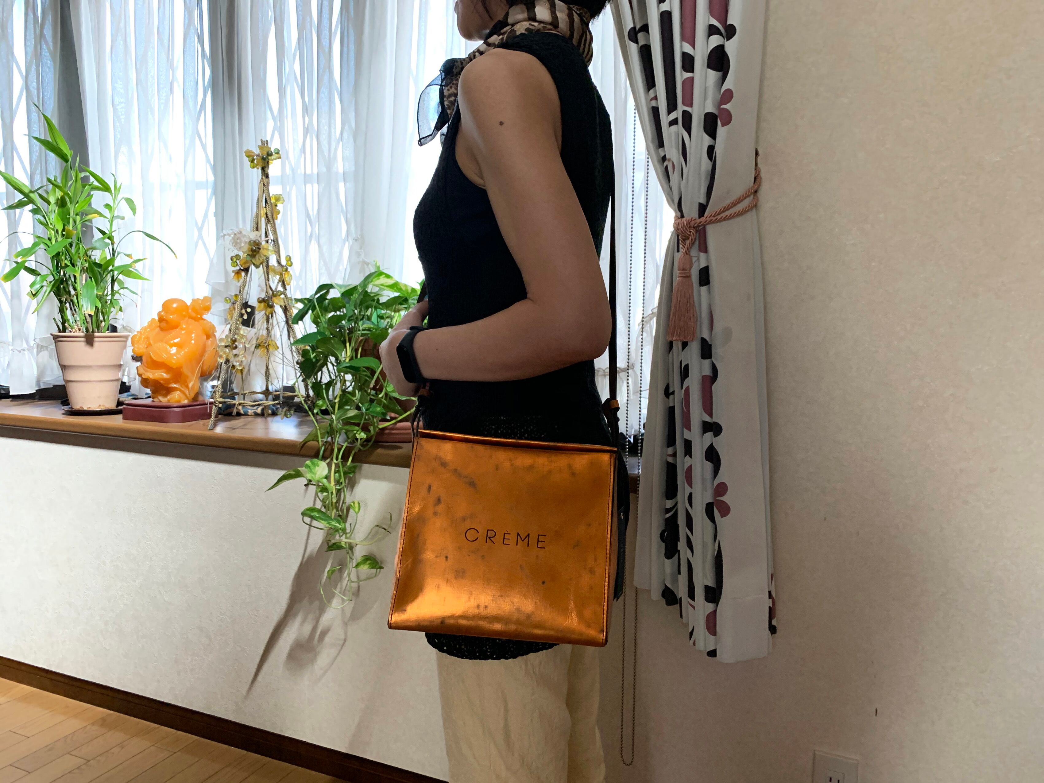 箔を貼ったキップレザーにヴィンテージ加工を施しているため、見た目以上に軽いバッグです。