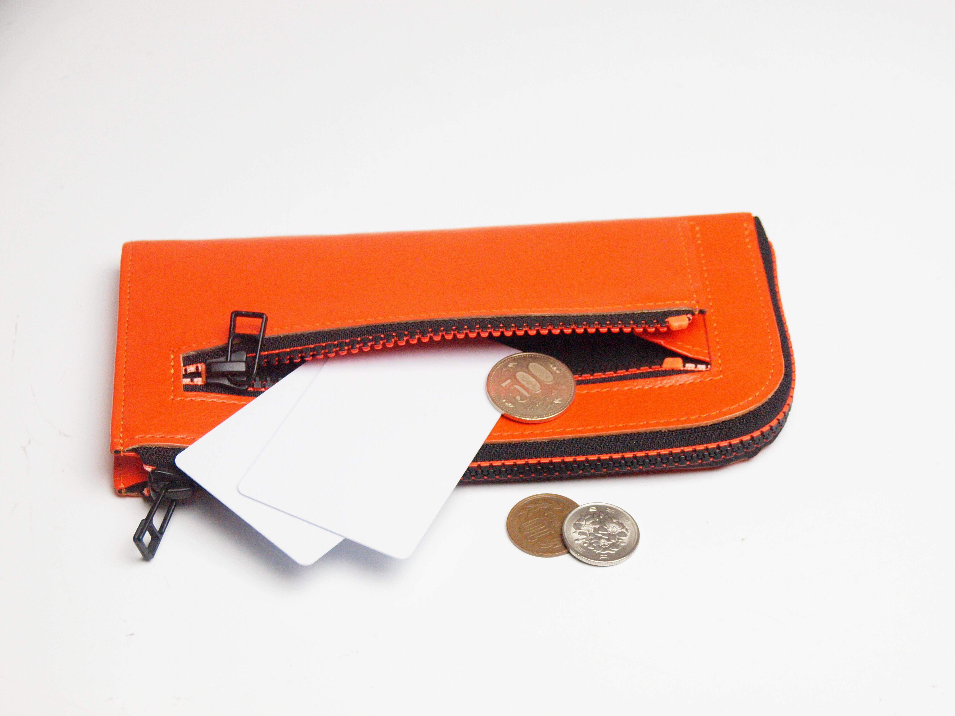 L字型の長財布です。札入れは2つ、カードポケットは12,後ろ側にマチ付ファスナーが付いています。