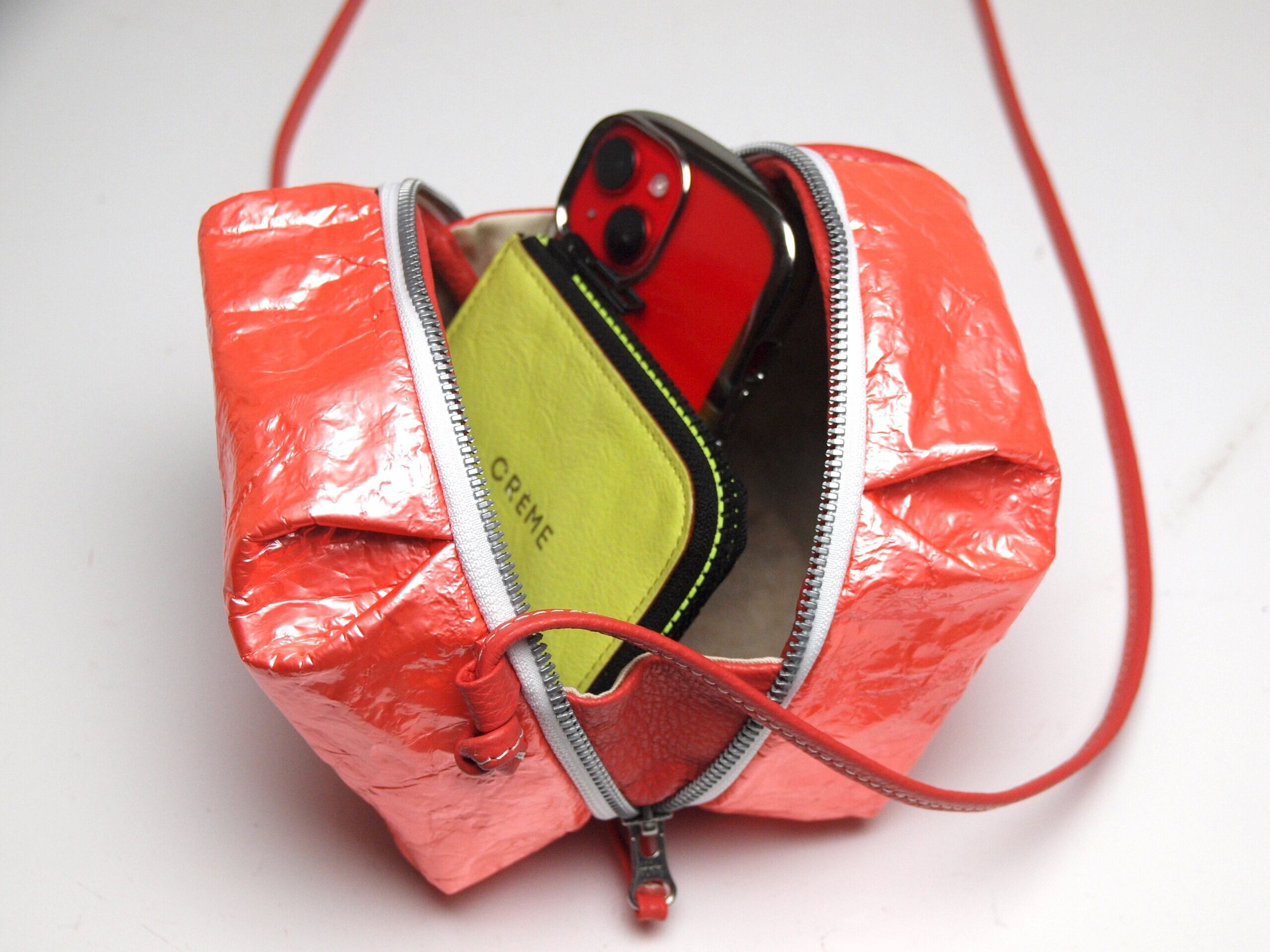 コロンと可愛い丸型ポシェットで、短財布や小物類など必要最小限度の収納が出来るサイズです。